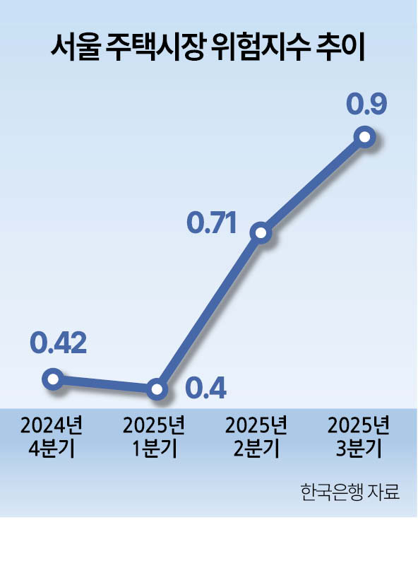 23일 한국은행의 ‘2025년 하반기 금융안정보고서’에 따르면 3분기 서울의 ‘주택시장 위험지수’는 0.9로 해당 지수를 산출하기 시작한 2010년 1분기 이후 최고치를 기록했다. 이 지수는 2021년 1분기 0.87로 정점을 찍은 뒤 하락하다가 2023년 4분기(0.25) 이후 다시 오르고 있다.
