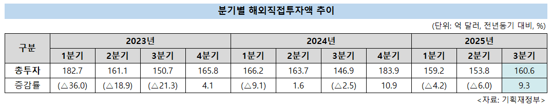 23일 기획재정부에 따르면 올해 3분기(7~9월) 우리나라 해외직접투자액은 총투자 기준 160억6000만달러로 전년 동기(146억9000만달러) 대비 9.3% 증가했다. 직전 분기(153억8000만달러)와 비교해도 4.4% 늘었다. 해외직접투자는 작년 4분기 증가한 뒤 올해 1분기(-4.2%), 2분기(-6.0%) 연속 감소했다.