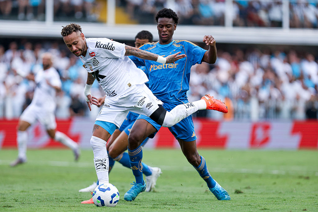| 지난 7일 산투스 포워드로 나선 네이마르 주니오르가 상대팀 크루제이루 수비수와 볼 다툼을 하고 있다. [게티이미지] |