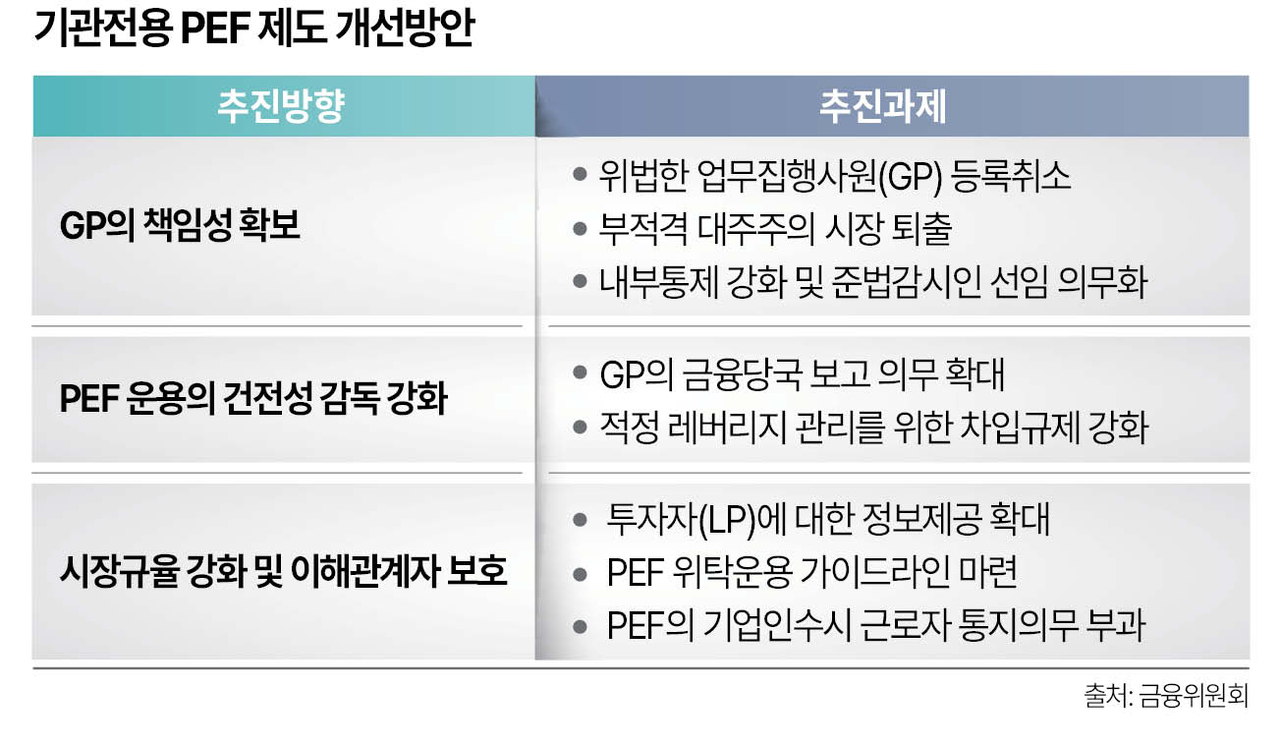 글로벌 투자사와 동일선상에서 경쟁할 수 있는지도 관건이다. 규제 적용에서 상대적으로 자유로운 외국계 PEF는 물론, 제재 수단이 세분화된 금융회사와 비교해도 국내 PEF만 과도한 책임을 지게 될 수 있다는 우려가 나온다.