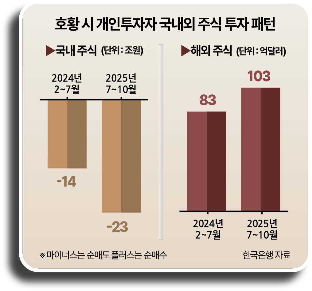 최근 개인투자자는 국내 및 해외 주식 투자에서 대체 관계가 강화되는 흐름을 보였다. 호황기였던 2024년 2~7월 개인은 국내 주식을 14조원 순매도하고, 해외주식은 83억달러 순매입했다. 올해 7~10월에도 개인투자자는 국내 주식을 23조원 순매도하고 해외주식을 103억달러 순매입했다.