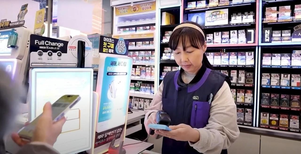 | 편의점 계산대에서 이명아 대표가 바코드 스캐너로 상품을 스캔하고 있는 사진이다. 손님은 휴대전화를 들고 결제를 준비하고 있다. |