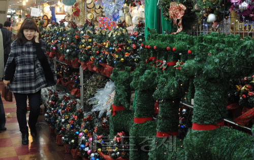 | 서울 중구 남대문시장 내 도매 상가에 다양한 트리와 장식품이 진열되어 크리스마스 분위기를 자아내고 있다. 임세준 기자 |