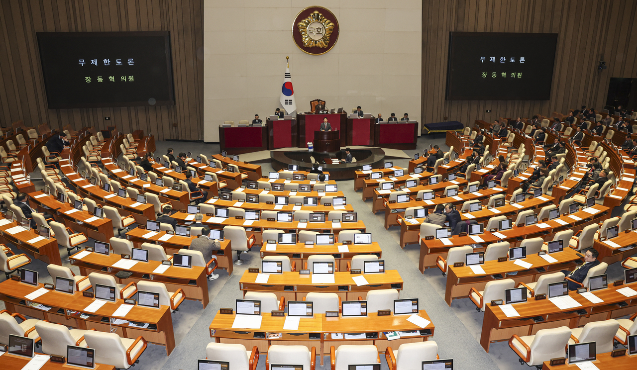 | 장동혁 국민의힘 대표가 지난 22일 국회에서 열린 본회의에서 12·3 윤석열 비상계엄 등에 대한 전담재판부 설치 및 제보자 보호 등에 관한 특별법에 대한 무제한 토론을 하고 있다. 임세준 기자 |