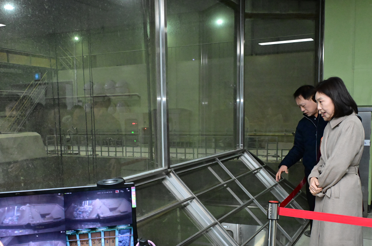 | 최호정 서울특별시의회 의장이 23일 마포자원회수시설을 방문, 대응 현황을 점검 했다. 최 의장은 크레인실 내부를 바라보며 점검하고 있다. |