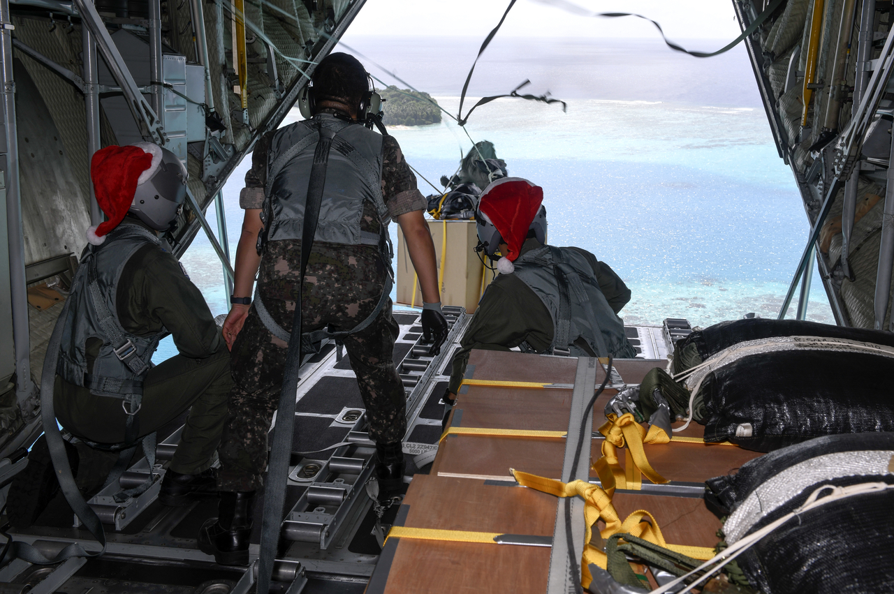 최근 공군은 미 태평양 공군사령부가 주관하는 ‘크리스마스 공수작전’에 참가했다. 괌 남쪽 미크로네시아 지역 10여 개 섬에 의약품과 의류, 생활필수품 등 구호물자를 낙하산에 매달아 약 60m 고도에서 투하하는 방식으로 전달하는 작전이다.