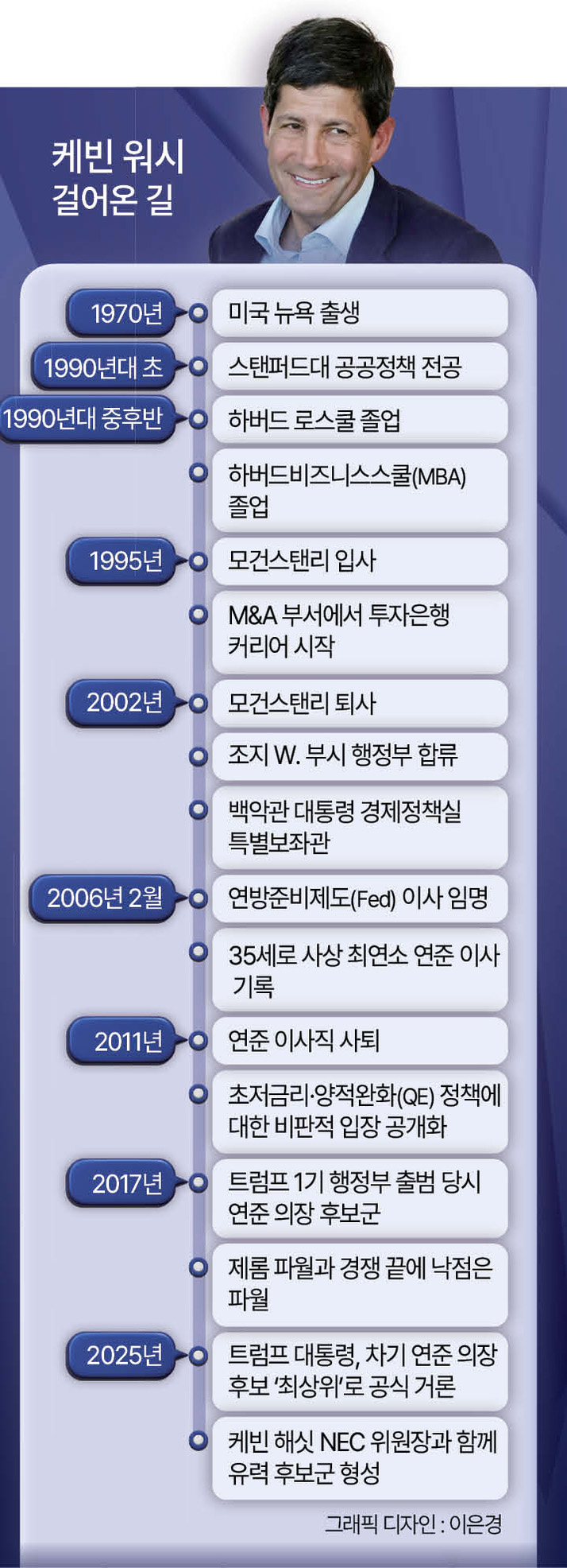 1970년 뉴욕에서 태어난 워시는 미국식 엘리트 코스의 전형을 밟아온 인물이다. 유대계 가정에서 자라 스탠퍼드대에서 공공정책을 전공한 뒤 하버드 로스쿨과 하버드 비즈니스 스쿨을 차례로 졸업했다. 법과 정책, 금융을 두루 아우르는 학력은 이후 그가 “시장과 제도, 정치 언어를 동시에 이해하는 인물”로 평가받는 배경이 됐다.