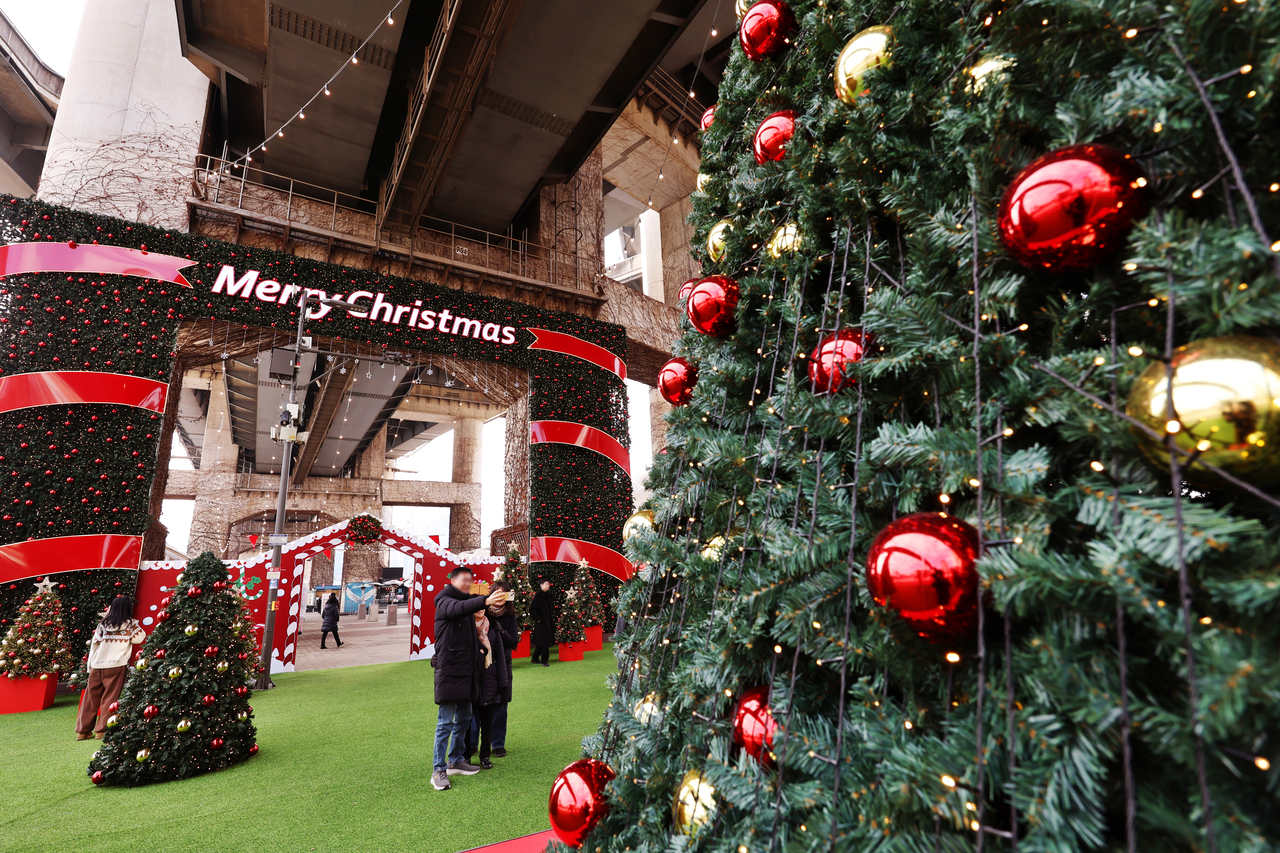 | 24일 서울 광진구 뚝섬한강공원 자벌레 및 청담대교 하부 일원에서 열린 ‘2025 로맨틱 한강 크리스마스 마켓’을 찾은 시민들이 트리 앞에서 사진을 찍고 있다. [연합] |