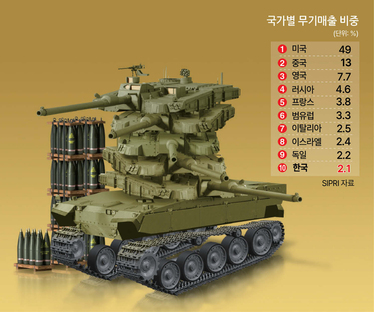 국가별 시장 점유율은 미국 49%, 중국 13%, 영국 7.7%, 러시아 4.6%, 프랑스 3.8% 순이었다. 이탈리아 2.5%, 이스라엘 2.4%, 독일 2.2%, 한국 2.1%, 일본 2.0%을 기록했다. SIPRI는 “우크라이나 전쟁으로 인해 무기 등 수요가 크게 증가했다”며 “새로운 군사장비 개발, 보급품 재입고, 파괴된 장비 교체 등에 힘입어 지난 2년간 군수업체의 매출이 크게 늘었다”고 설명했다.
