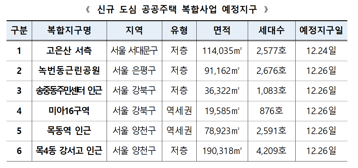 [헤럴드경제=홍승희 기자] 한국토지주택공사(LH)는 서울 내 목동역 등 총 6곳, 1만4012세대에 대해 도심 공공주택 복합사업 예정지구로 지정 공고됐다고 26일 밝혔다.