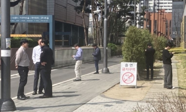 | 회사 근처에서 담배를 피우는 직장인들. 손인규 기자 |