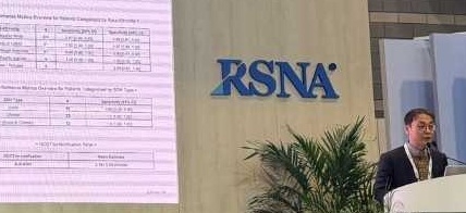 | 제이엘케이 김동민 대표가 최근 열린 ‘북미영상의학회(RSNA 2025)’에서 AI 기반 뇌졸중 영상분석 솔루션의 연구결과를 공개하고 있다. |