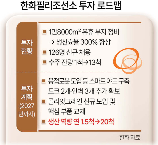 ▶인수 후 1만8000㎡ 부지 정비 거쳐…내후년까지 투자 계속=이를 포함해 한화가 인수 이후 새롭게 정비한 조선소 면적은 1만8000㎡에 달한다. 이 과정에서 한화오션의 대형 블록 공법이 적용돼 해당 공정의 생산능력은 기존 대비 두 배 이상 확대됐다. 기존의 유휴 부지는 블록 및 자재 적치 공간으로 만들어 생산 효율을 약 300%까지 끌어올렸다. 이런 과정을 한화 인수 직전 1척에 불과했던 한화필리조선소 수주 잔량은 현재 13척으로 늘어났다.