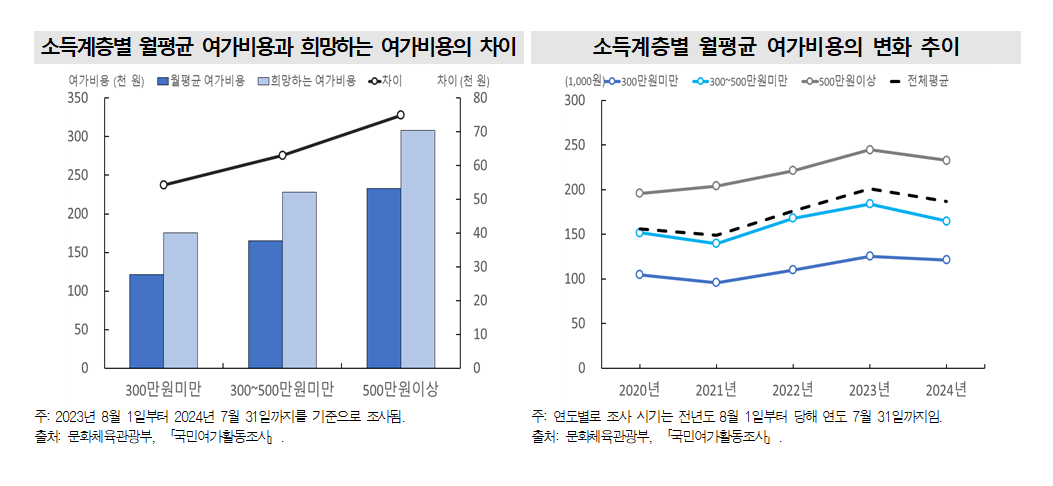 소득 계층별 여가 행태에서도 격차가 확인됐다. 가구소득 500만원 이상 집단의 월평균 여가비용은 23만3000원으로, 300만원 미만 집단(12만1000원)의 약 1.9배였다.