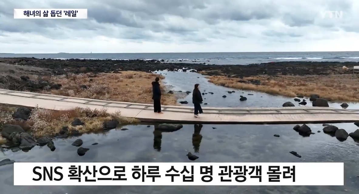 | 해녀레일로 찾아와 재미있는 사진을 찍고 있는 관광객들 [KCTV 제주방송 보도를 전하는 YTN 화면 캡쳐] |
