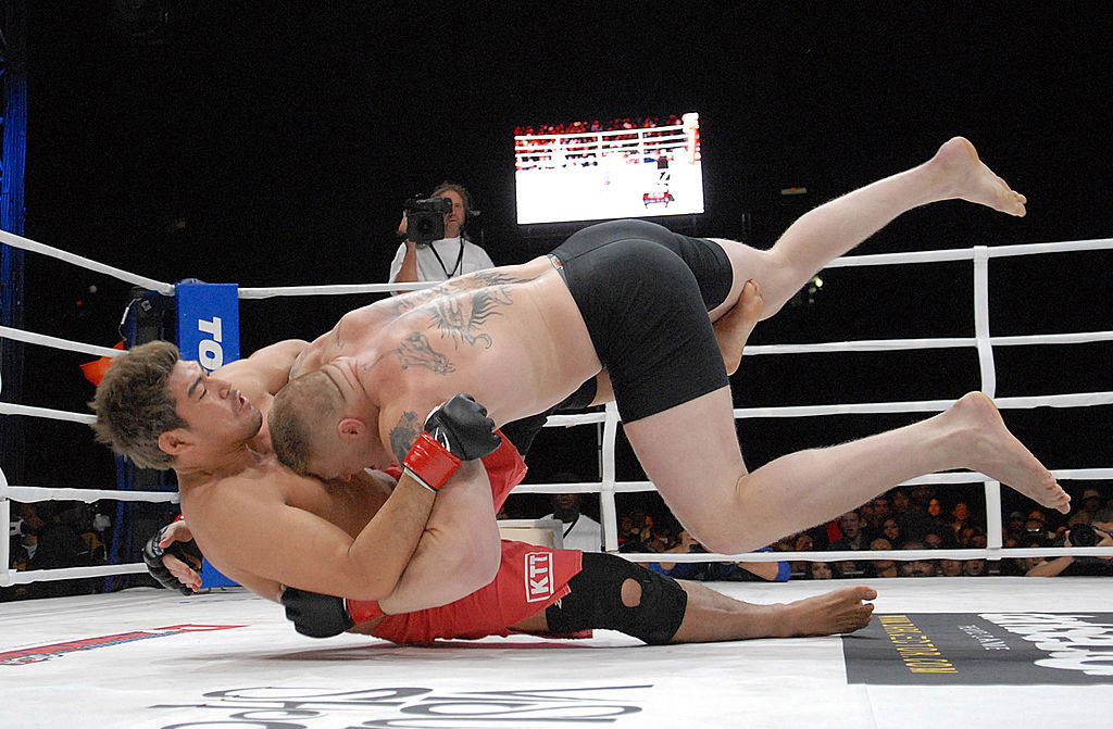 | 2007년 K-1 히어로즈 다이너마이트 USA 대회에서 브락 레스너가 ‘미스터 샤크’ 김민수를 태클로 넘어뜨리고 있다. [게티이미지] |