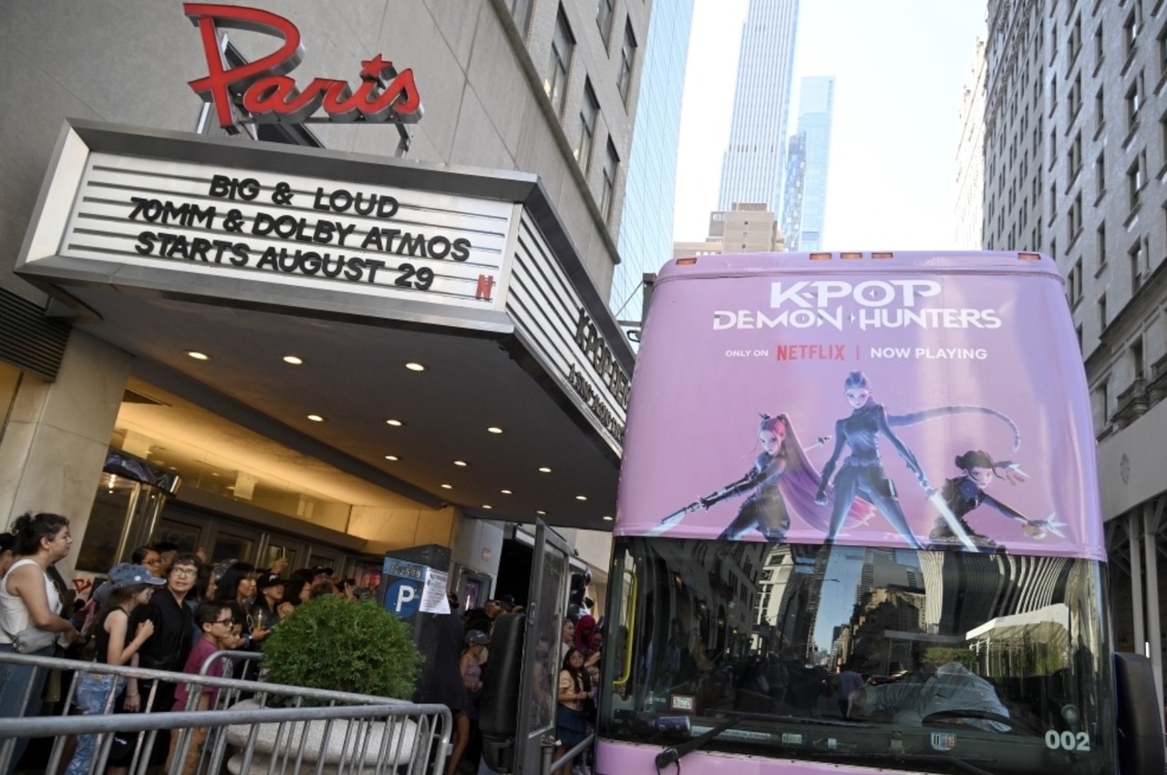 | 지난 8월 ‘케이팝 데몬 헌터스’ 싱어롱 상영을 홍보하는 포스터가 장식된 2층 버스가 미국 뉴욕의 한 극장 앞에 서 있다. [로이터] |