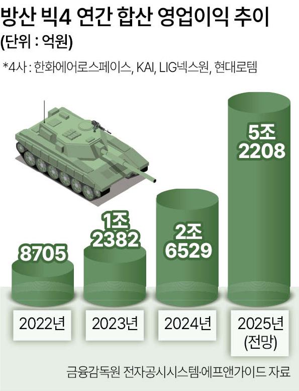 29일 금융정보업체 에프앤가이드에 따르면 방산 4사의 2025년 연간 합산 영업이익 컨센서스는 사상 최대 수준인 총 5조2208억원에 달했다. 올해 초만 해도 3조원대 수준이었던 합산 영업이익 전망치는 하반기 들어 4조원대로 상향된 데 이어, 연말에는 5조원대까지 높아졌다. 업체별로는 한화에어로스페이스 3조4940억원, 현대로템 1조600억원, LIG넥스원 3507억원, KAI 3161억원 순으로 전망됐다.