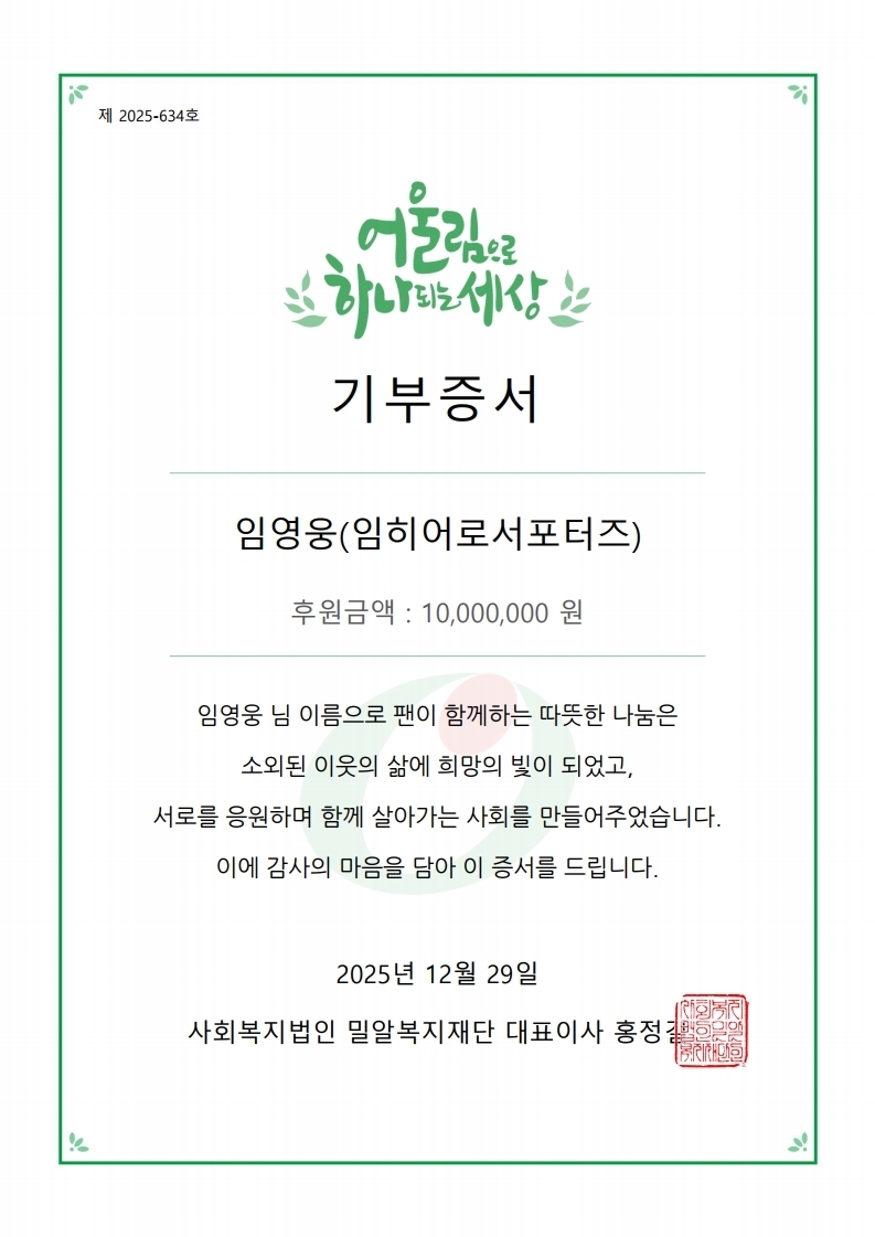 [헤럴드경제 = 서병기선임기자]임영웅의 팬클럽 ‘임히어로서포터즈’가 밀알복지재단에 1,000만원을 기부하며 따뜻한 연말 나눔에 동참했다.