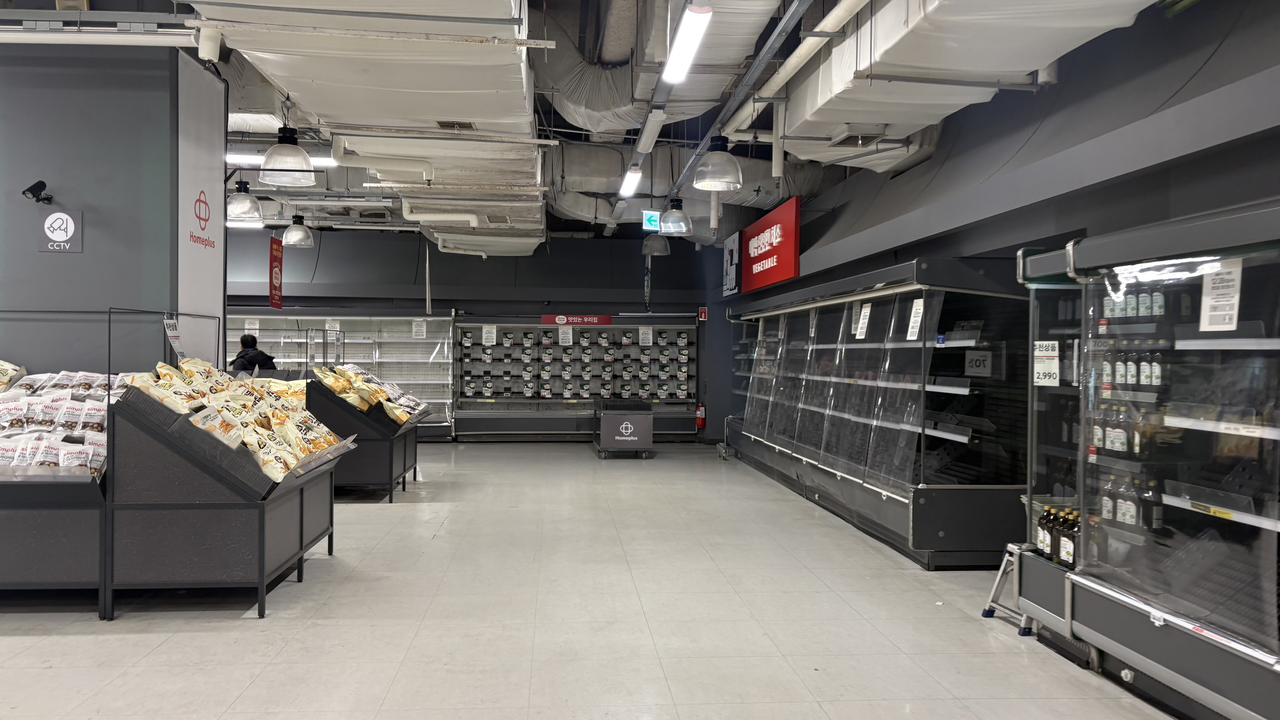 영업 중단을 앞둔 가양점 내부는 이미 텅 비어 있었다. 신선식품은 자취를 감췄고, 고기·생선·채소 코너에는 과자와 PB(자체브랜드) 상품이 진열돼 있었다. 라면, 과자 등 코너에도 일부 브랜드 상품이 듬성듬성 놓여 넒은 진열대를 간신히 채웠다.
