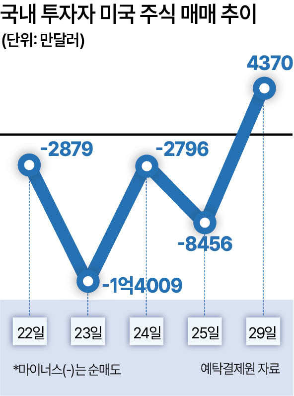 30일 한국예탁결제원에 따르면 국내 투자자와 일부 기관은 22일부터 25일까지 4일 연속 미국 주식을 순매도했다. 이들이 4일간 순매도한 규모는 총 2억8140만달러(약 4069억원)에 달했다. 29일 4370만 달러 순매수까지 고려해도 최근 총 2억3770만달러를 순매도했다. 15일부터 최근 2주일간 거래를 기준으로 총거래일 10일 중 6일이 순매도였다.