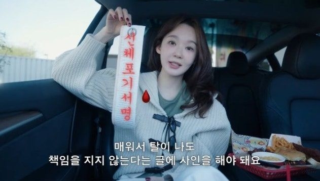 그런데 강민경이 주문을 한 뒤 받은 종이에는 ‘본 메뉴는 극도로 매운 음식이며, 섭취로 인해 신체적 부상, 재산 피해, 정신적 고통, 나아가 사망에 이를 수 있는 위험이 발생할 수 있음을 인지하고 이에 동의한다’는 내용이 담겨 있었다.