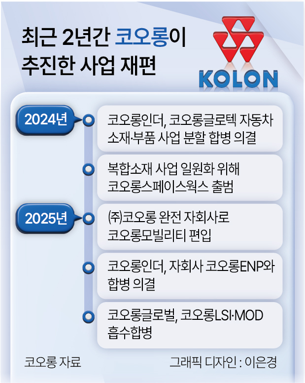 대표적으로 핵심 계열사인 코오롱인더스트리는 지난해 자회사인 코오롱글로텍의 자동차 소재·부품 사업의 분할 합병을 의결했다. 그룹 차원에서는 복합소재 사업을 일원화하기 위해 코오롱스페이스웍스를 출범했다.
