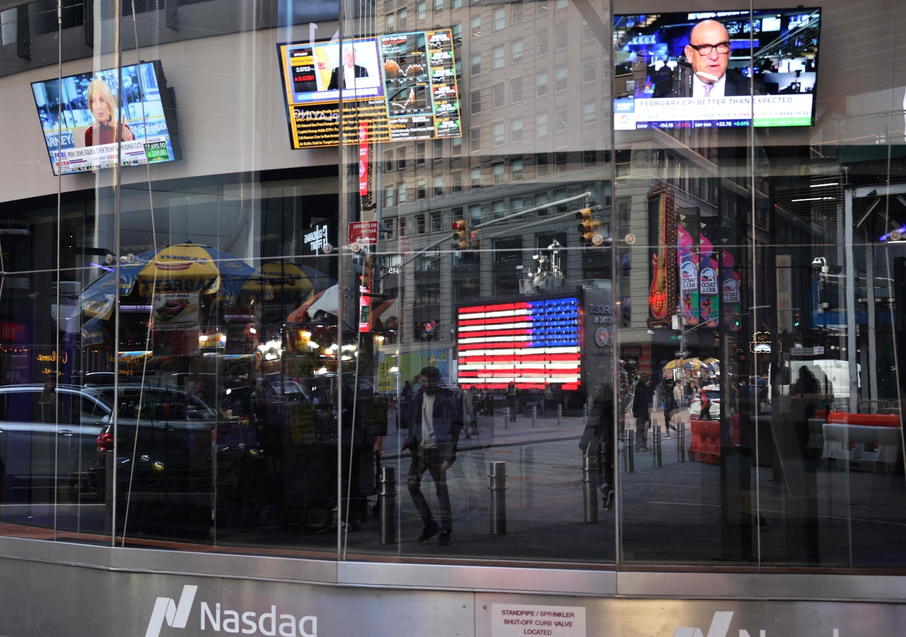 | 미국 뉴욕 타임스퀘어의 나스닥 마켓사이트 창문 너머에 있는 모니터에서 금융 시장에 대한 뉴스가 나오고 있다. [AFP] |