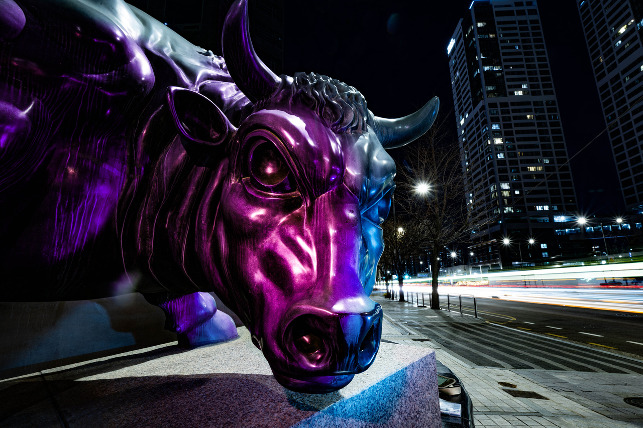 | 2025년 한 해 동안 코스피(KOSPI)는 75.89%에 달하는 역대급 상승을 달성하며 4000선을 돌파, 한국 증시 역사상 유례없는 기록을 세웠다. 이는 주요국 증시와 비교해도 압도적 1위다. 인공지능(AI) 반도체 호황, 정부의 증시 활성화 정책 및 불확실성 해소 등에 힘 입어 외국인 매수세가 이어진 영향으로 풀이된다. 시장에서는 내년에는 이재명 대통령 지난 6월 취임하며 강조한 ‘코리아 프리미엄 실현을 통한 코스피 5000 시대 도약’도 가능하다는 전망이 나온다. 지난 26일 오후 서울 여의도 금융투자협회 앞 황소상이 우직하게 자리를 지키고 있다. 임세준 기자 |