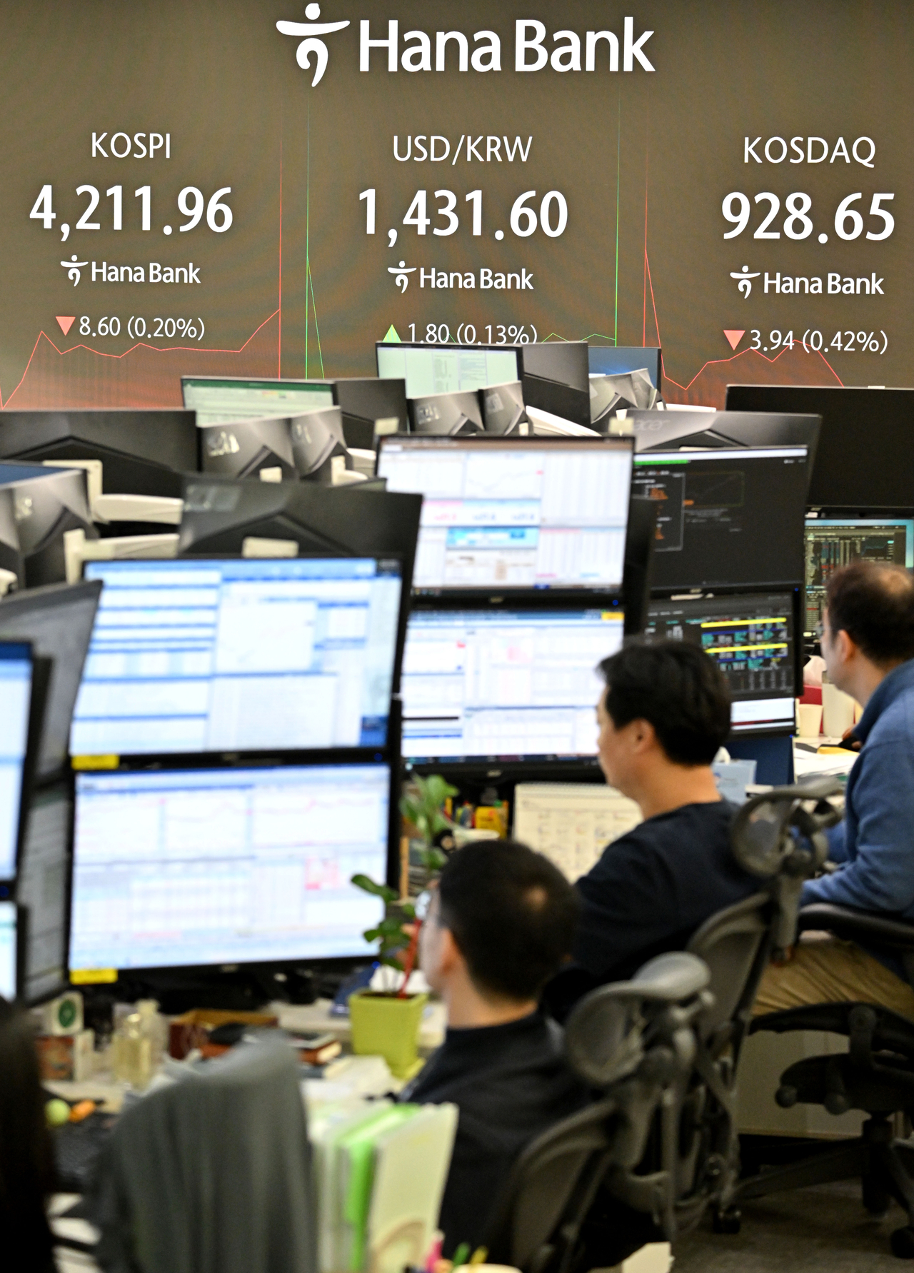 | 코스피 지수가 2025년 마지막 거래일인 30일 하락 출발했으나, 4200선을 지키며 보합권에서 등락하고 있다. 이날 서울 중구 하나은행 딜링룸 전광판에 오전 9시 17분 기준 코스피 지수가 전 거래일보다 8.60포인트 하락한 4211.96포인트, 코스닥 지수가 3.94포인트 하락한 928.65포인트를 나타내고 있다. 원/달러 환율은 1431.60원이다. 임세준 기자 |