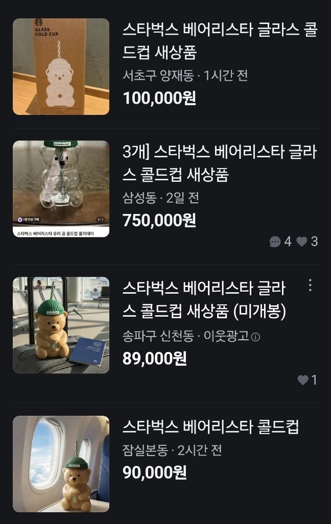 31일 당근마켓과 번개장터 등에는 ‘스타벅스 베어리스타 콜드컵’을 판매한다는 글이 잇따라 올라왔다. 미개봉 새 상품을 보유하고 있다는 글부터 “오픈런해서 데려왔다” 등 어렵게 구한 사정을 알린 내용 등 수십 건이 게시됐다. 가격은 8만원부터 25만원까지 다양했다.