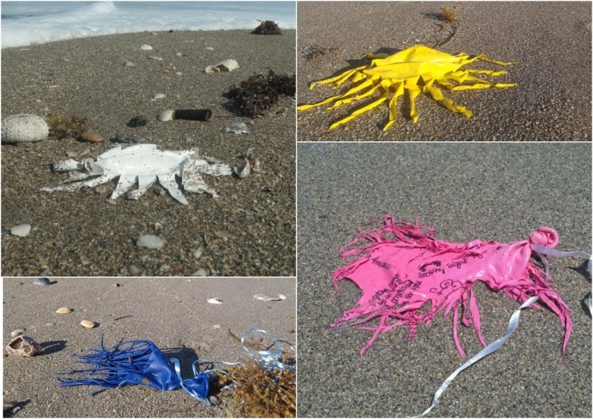 | 미국 한 해안에 떨어진 라텍스 풍선 잔해. 해파리, 오징어 등과 비슷한 모습이다.[미국 환경단체 벌룬즈 블로우(Balloons Blow) 홈페이지 갈무리] |