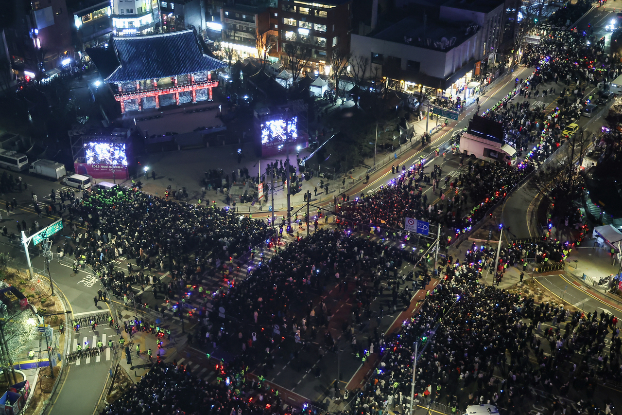 전날 오후 6시부터 보신각 일대 3개 도로(종로·우정국로·청계북로)의 차량 운행을 통제 중이다. 운행은 오전 7시께 재개된다.