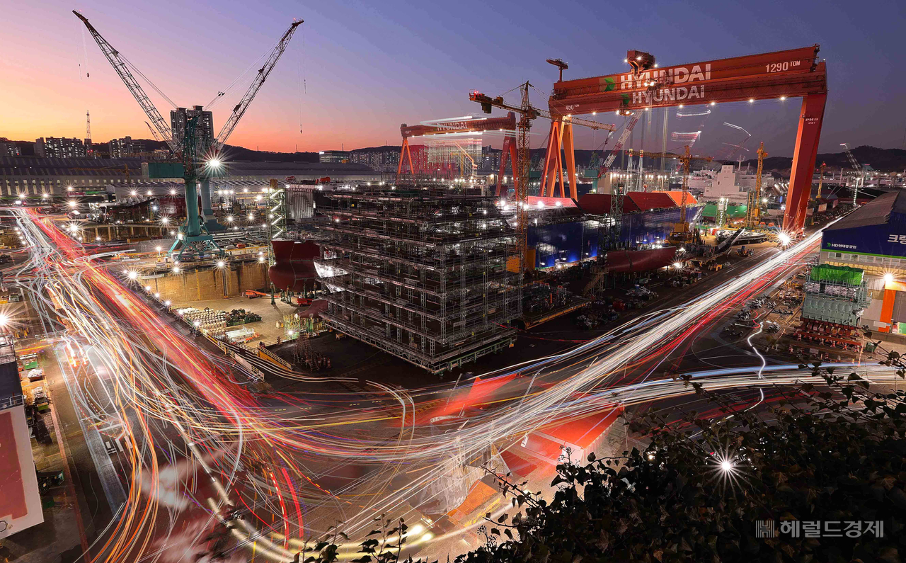 | 울산광역시 HD현대중공업에는 영하의 한파 속에서 조선소 근로자들이 뿜어내는 열기가 가득하다. 울산=이상섭 기자 |