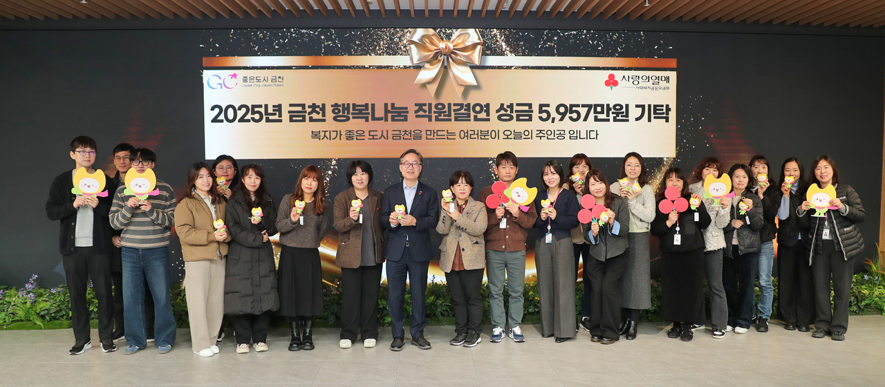 | 금천구 ‘2025년 금천 행복나눔 직원결연 성금 5957만원 기탁식’. 현수막에는 ‘모두가 살기 좋은 도시 금천을 만드는 아름다운 동행이 되어주세요!’라는 문구가 적혀 있다. |