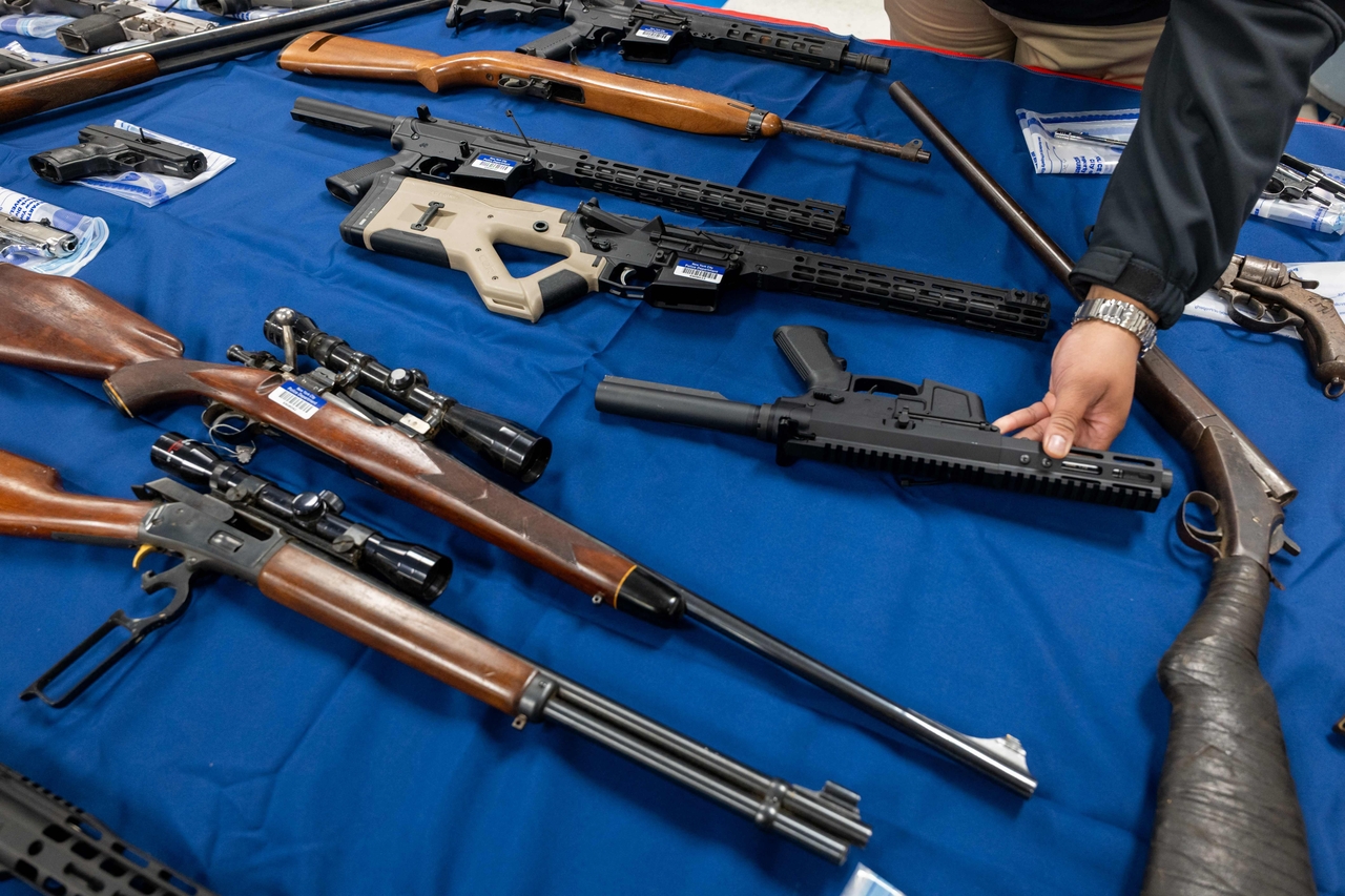 | 12월 6일(현지시간) 뉴욕시 브루클린 이스트 뉴욕 지역에서 열린 총기 반납 행사 후 기자회견에서 다양한 크기와 구경의 총기들이 전시되어 있다. 사진은 기사 내용과 관련 없음. [AFP} |