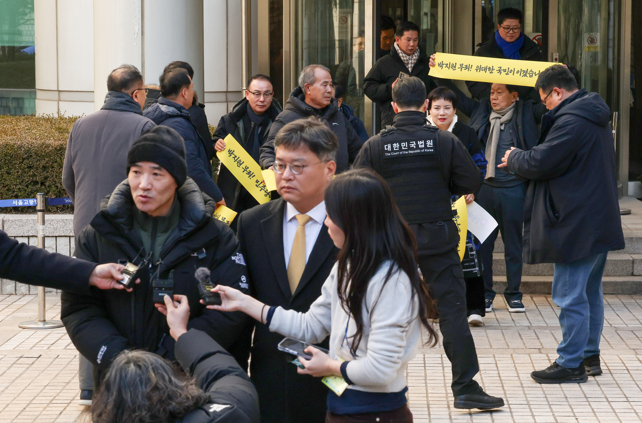 | 2020년 9월 서해에서 발생한 공무원 피격 사건과 관련해 유가족 이래진(앞줄 왼쪽) 씨가 지난해 12월 26일 서울 서초구 서울중앙지방법원에서 열린 서훈 전 청와대 국가안보실장, 박지원 전 국정원장, 서욱 전 국방장관 등에 대한 1심 선고공판 뒤 법정을 나서며 발언하고 있다. [연합] |