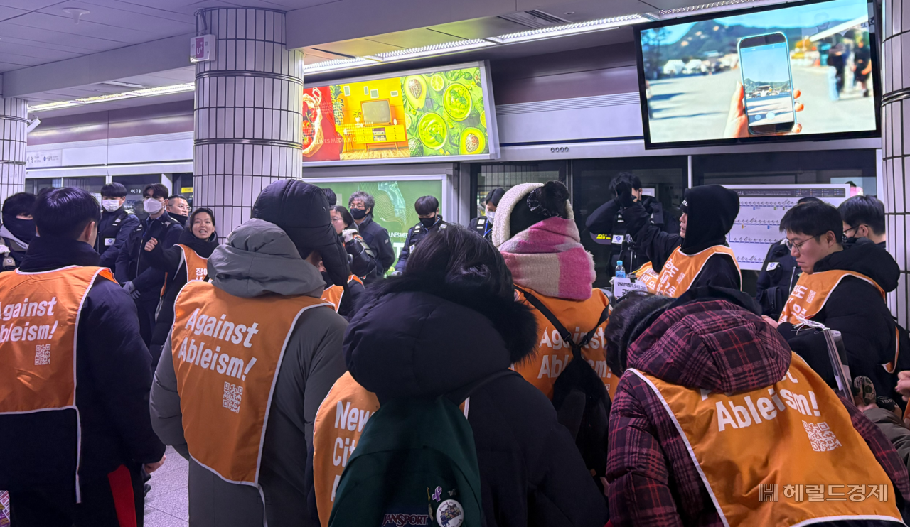 [헤럴드경제=정주원 기자] 2일 오전 새해 첫 출근길을 맞은 서울 지하철 1호선 시청역은 ‘이동권’을 둘러싼 긴장으로 멈춰 섰다. 전국장애인차별철폐연대(전장연)가 장애인 이동권 보장을 요구하며 출근길 지하철 시위에 나서자, 열차는 잇따라 무정차 통과했고 시민들은 발길을 돌려야 했다.