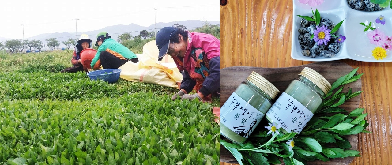 | 전남 구례군에서 쑥부쟁이를 수확하는 모습(왼쪽), 쑥부쟁이 가루 [쑥부쟁이 연구소 제공] |