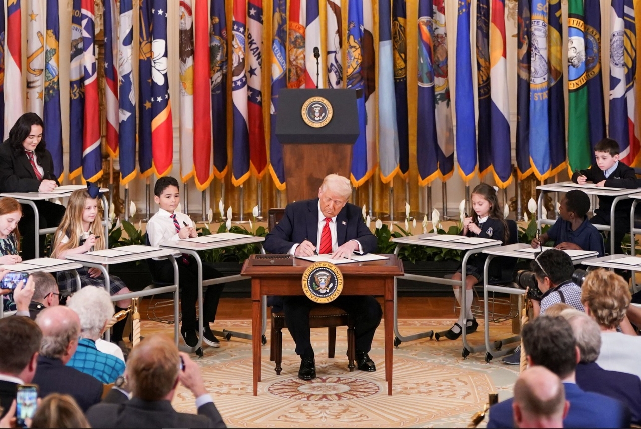 | 도널드 트럼프 미국 대통령(가운데)이 지난해 4월 다양한 학년의 학생들을 백악관에 불러 모아놓고, 교육부의 기능을 대폭 축소하는 내용의 행정명령에 서명했다. 이날 학생들도 행정명령 복사본을 받아 수업용 책상위에 두고, 각자 행정명령에 서명하는 ‘퍼포먼스’를 했다.[로이터] |