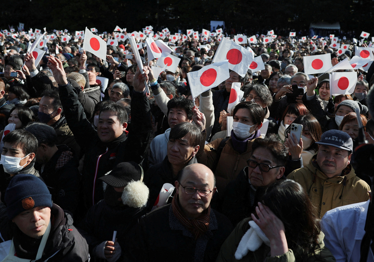 | 일본 증시 상승세가 이어지면서 일본 내 빈부 격차가 갈수록 확대되고 있는 것으로 나타났다. 사진은 2일 일본 도쿄 황궁 앞에 모인 시민이 일장기를 흔들며 새해 축하행사를 하고 있는 모습. [로이터] |