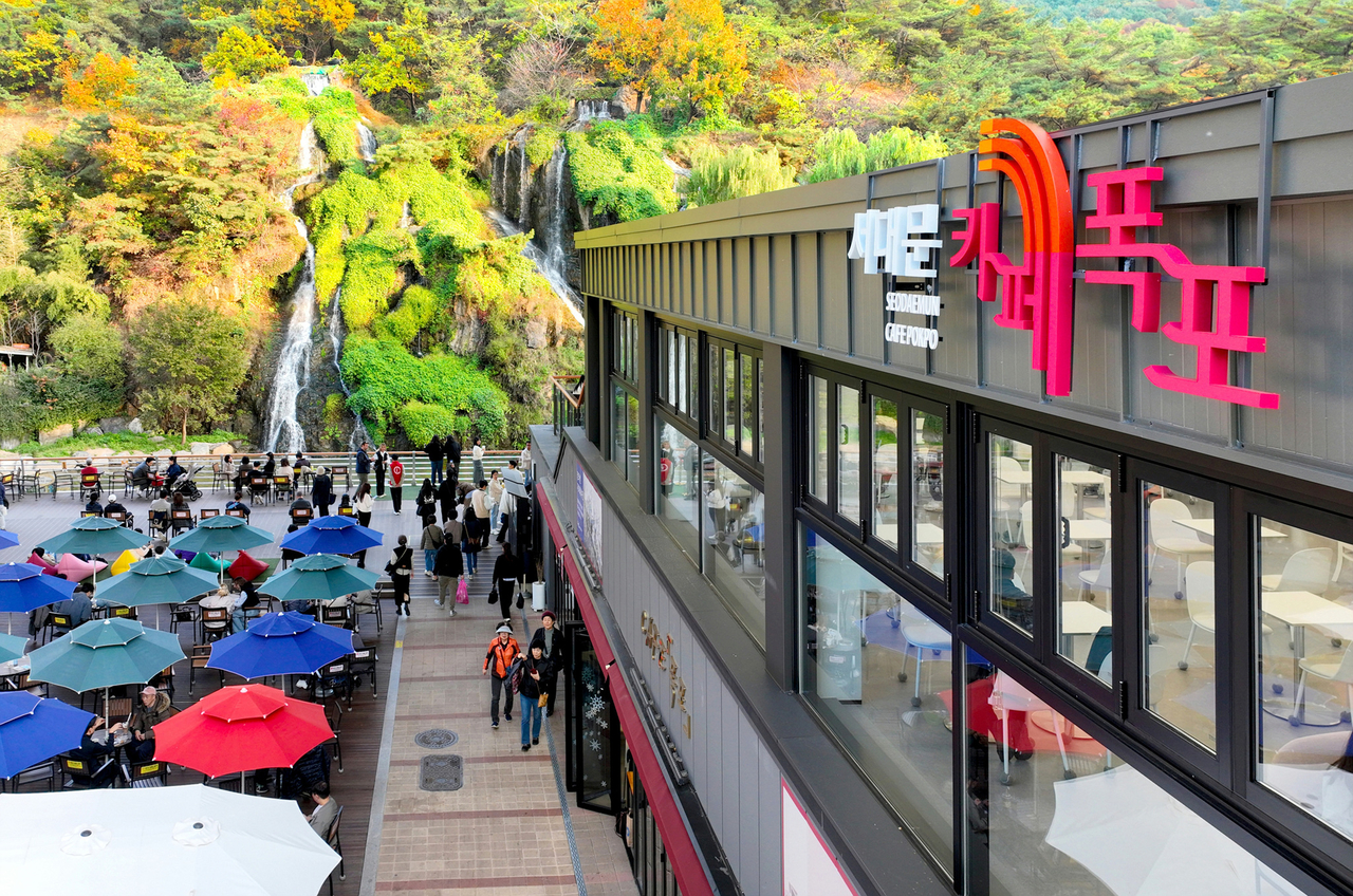 | 카페 폭포 전경을 찍은 사진이다.카페 건물 옆 테이블과 의자가 놓인 야외 공간에는 사람들이 앉아 있다. |