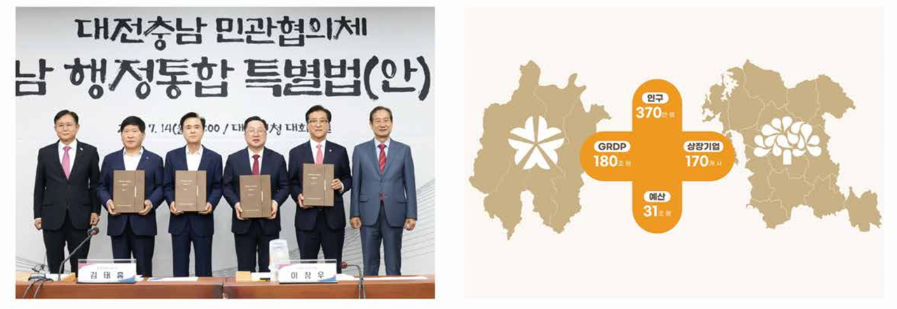 | 대전 충남 행정통합 추진: 인구 357만명, 지역내 총 생산 157조원, 통합특별시 추진 대전의 과학기술+충남의 산업인프라 효과 등. |