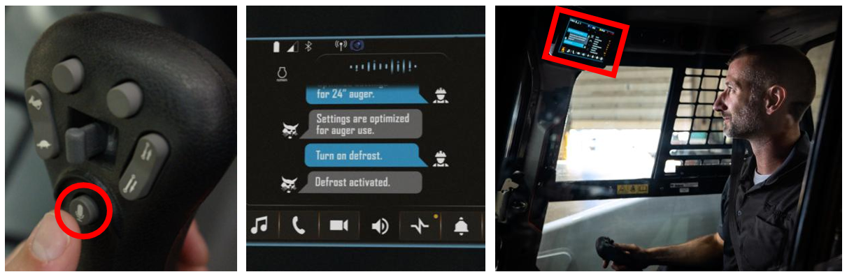 | 조이스틱에 위치한 음성 버튼(왼쪽 사진 동그라미 부분)을 누른 뒤 명령어를 말하면 운전석 내에 위치한 디스플레이(오른쪽 사진 네모 부분)를 통해 실시간 응답을 받고 작업을 명령할 수 있다. [두산밥캣 제공] |