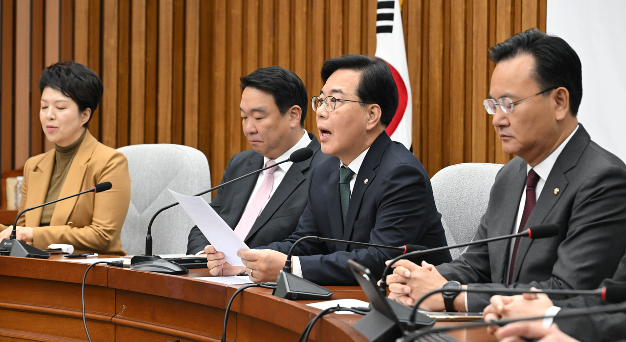 | 송언석 국민의힘 원내대표가 6일 오전 서울 여의도 국회에서 열린 원내대책회의에서 모두발언을 하고 있다. 이상섭 기자 |