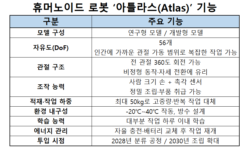 | 휴머노이드 로봇 ‘아틀라스(Atlas)’ 기능 표 |