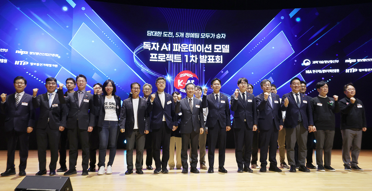 | 배경훈 부총리 겸 과학기술정보통신부 장관, 임문영 국가인공지능전략위원회 부위원장, 하정우 AI미래기획수석비서관 등이 지난달 30일 오후 서울 강남구 코엑스에서 열린 ‘독자 AI 파운데이션 모델’ 프로젝트 1차 발표회에서 기념촬영을 하고 있다. [연합] |