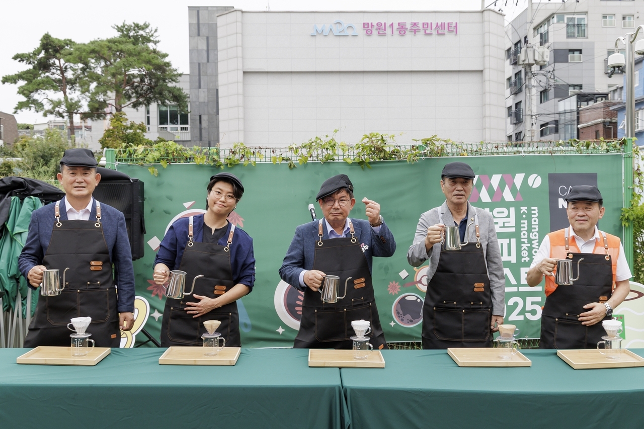| 박강수 마포구청장 등이 야외에서 커피를 내리는 모습이 담긴 사진이다.제목: 망원커피, 내용: 망원커피페스트 2025. |