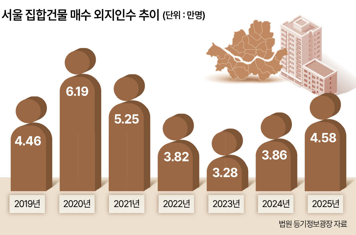 지난해 서울 집합건물을 매수한 외지인 수는 약 4만6000명에 달하는 것으로 나타났다. 이는 문재인 정부 시절 집값 급등이 본격화되던 2019년보다 높은 것으로, 2021년 이후 4년 만의 최고치다. 6·27 대출규제, 10·15 주택시장 안정화 대책 등 각종 규제가 잇따랐지만 오히려 규제 전 막차수요가 집중되고 ‘똘똘한 한 채’ 선호현상이 심화되며 외지인의 서울 원정투자가 확대된 것으로 풀이된다.