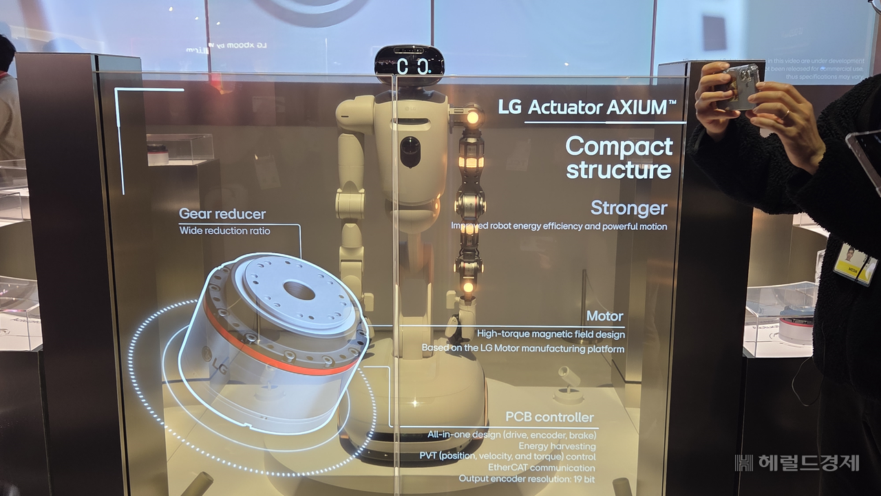 한편 LG전자는 폭발적으로 늘어나는 로봇 사업을 겨냥해 로봇용 액추에이터 브랜드 ‘LG 액추에이터 악시움(AXIUM)’도 전시장에서 처음 공개했다. 액추에이터는 회전력을 만드는 모터, 전기 신호를 제어하는 드라이버, 속도를 조절하는 감속기 등을 합친 모듈로 로봇의 관절 역할을 한다. LG전자는 냉장고·건조기에 쓰이는 AI DD 모터 등 가전 사업을 운영하며 글로벌 최고 수준의 부품 기술력을 축적해왔다.